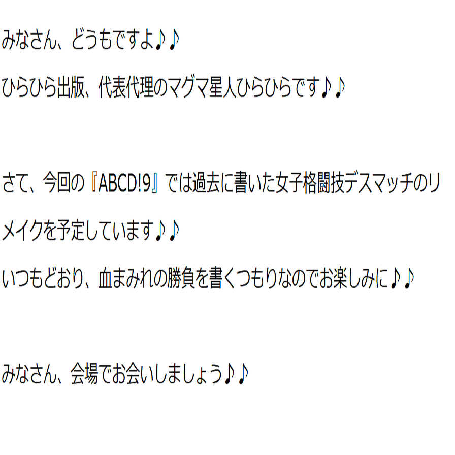 | サークル名: さしみやさん 執筆者: 推乃刺身 スペース: A-01 ウェブサイト: http://sasimiyasan.starfree.jp/ |